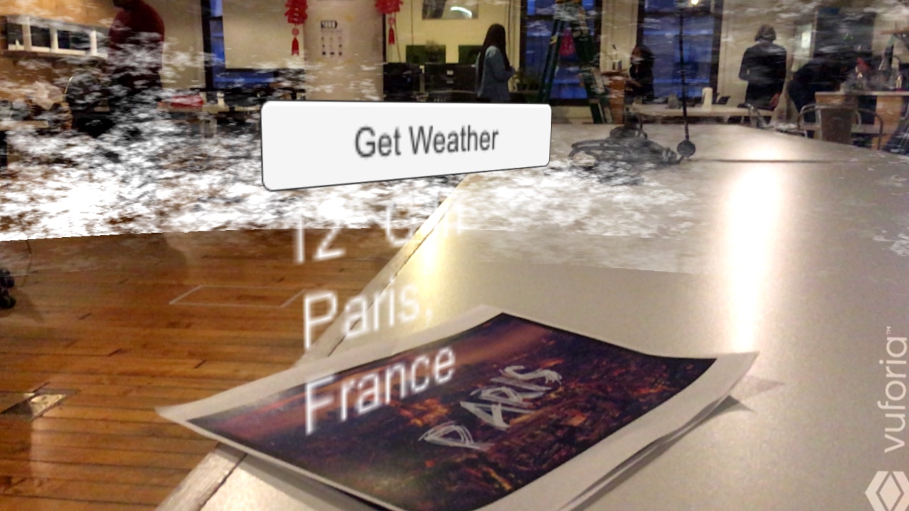 There are two interactive ways of getting the weather of the city you want to show on your phone. One is simply typing in the city name, while the other is to focus on a postcard of the city(an image target).