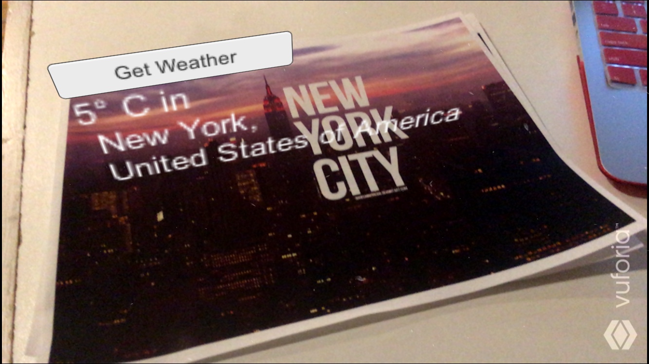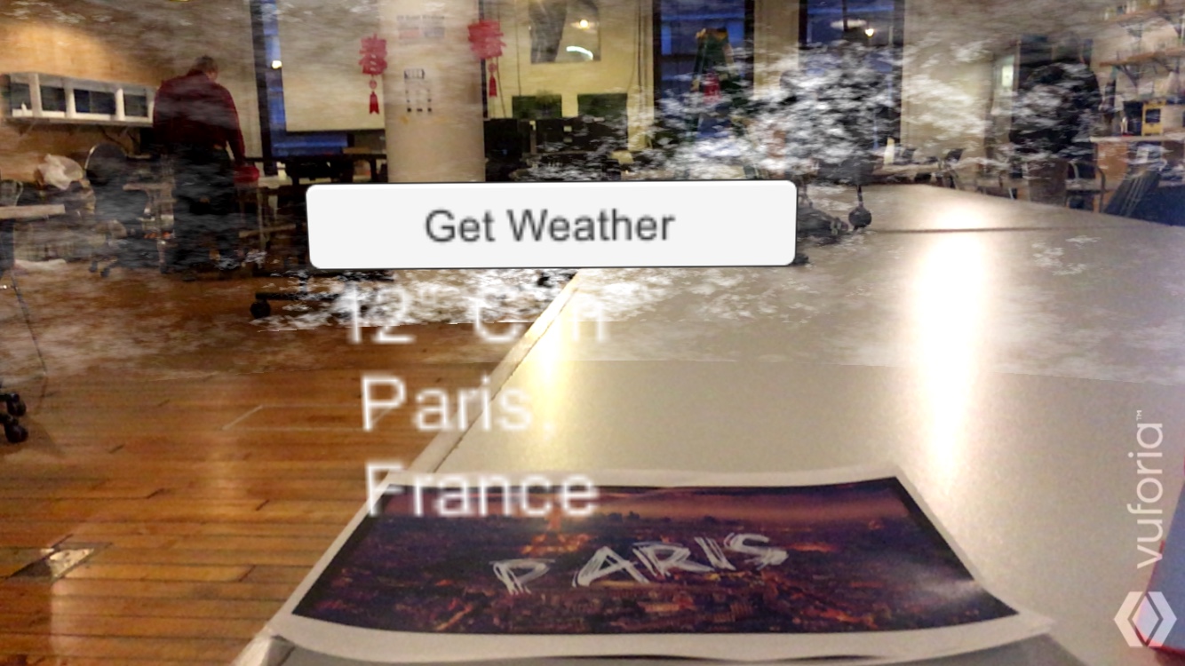 Augmented current weather condition is based on the openweather.org API and realized with Unity + Vuforia. The primary target users of this project are long distance couples. Showing the real-time weather condition and information of different cities around the world contrasting the user’s actual surrounding environment creates a powerful visual experience.