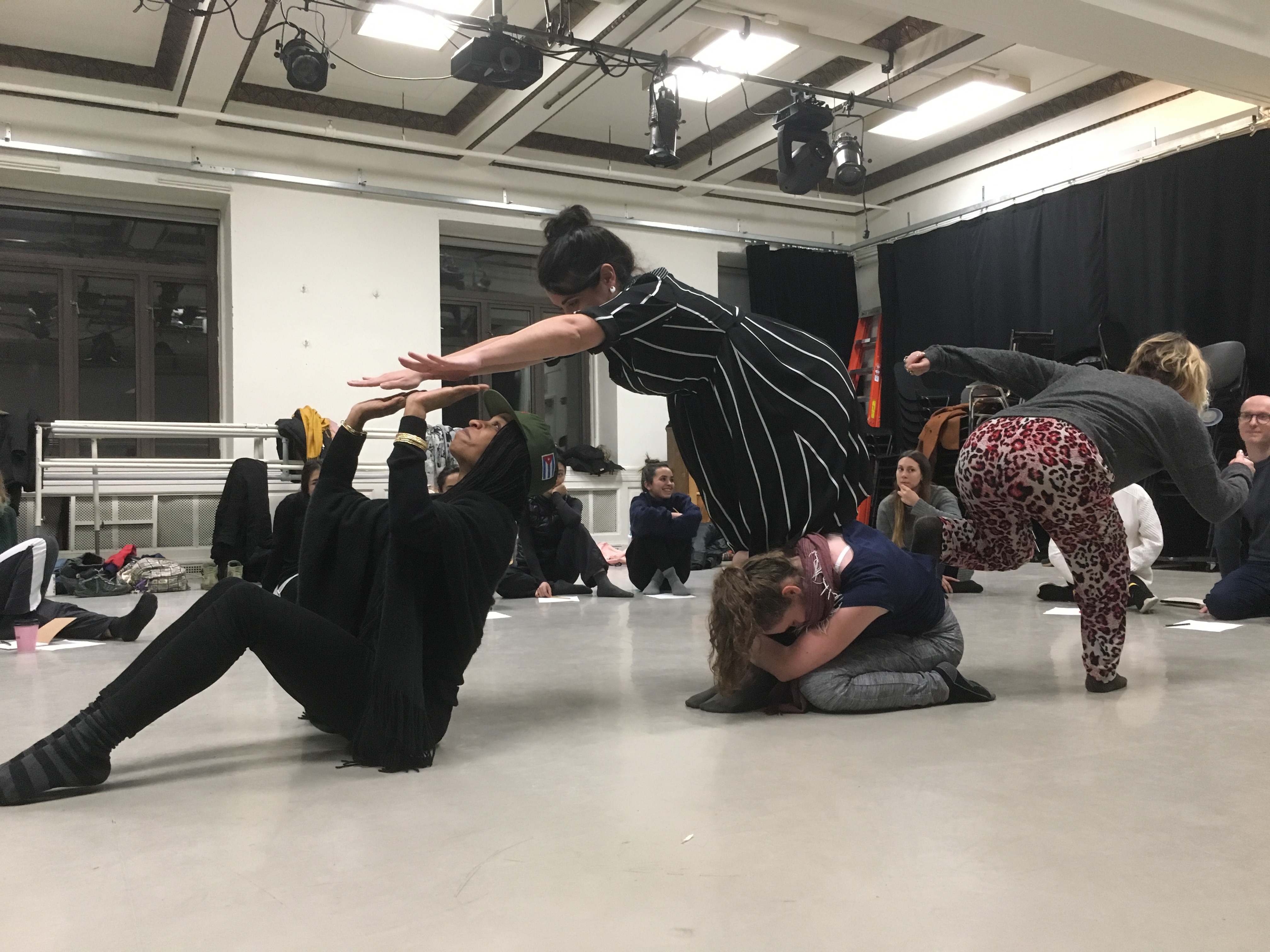A recorded drawing using this sketch (on loan from Lin Zhang from Dan Shiffman’s Nature of Code Spring 2018 class) is projected onto the floor of the dance space. A dancer mirrors the orbits of the “particles” in the sketch, shifting her center of gravity as the particles shift. While not in perfect unison, her localized gravitational field––as it manifests in her own body––parallels the forces that are simulated within the sketch. In effect, the pathways that the dancer and the sketch are following are dictated by unseen forces.